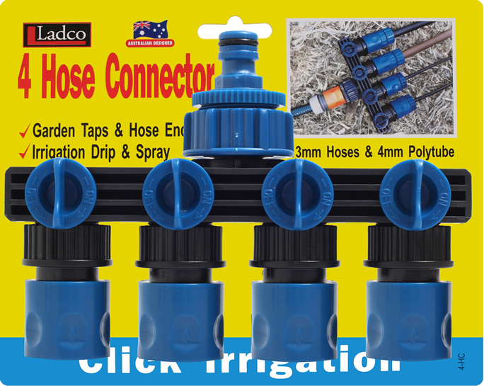 Fit on Garden Tap or Hose end. Then click-in 4mm, 6mm & 13mm male pipe fittings. For easy irrigation installation.